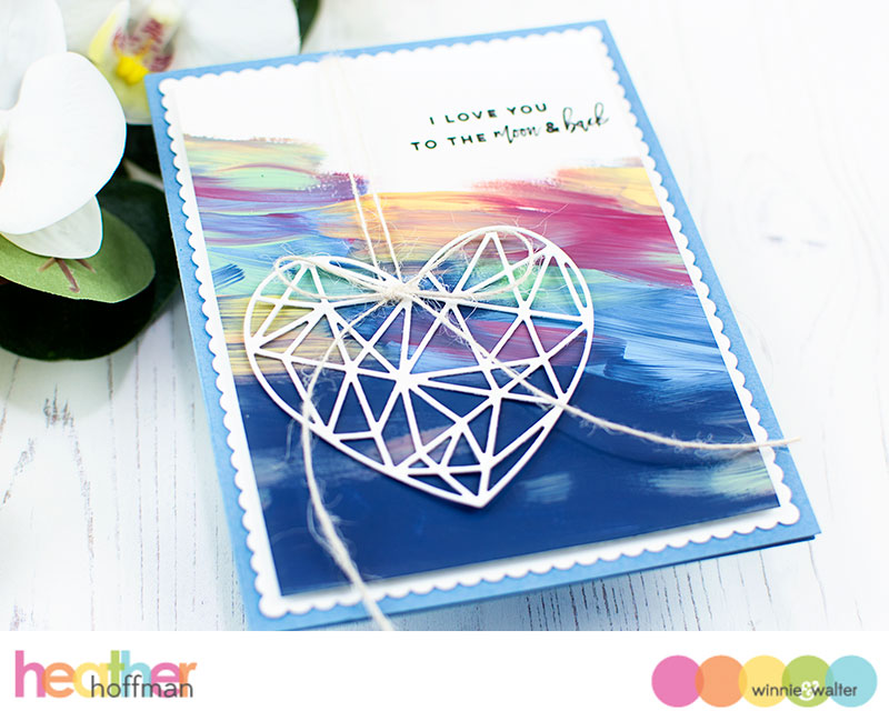 Once that dried, I die cut the detail heart from True Multifaceted Heart Cutaways from white cardstock, tied some twine onto it, and then adhered it onto my background, tucking the top of the twine behind the front of that panel. I also tied a bow on the top of it, using that to hide the adhesive behind the bow.