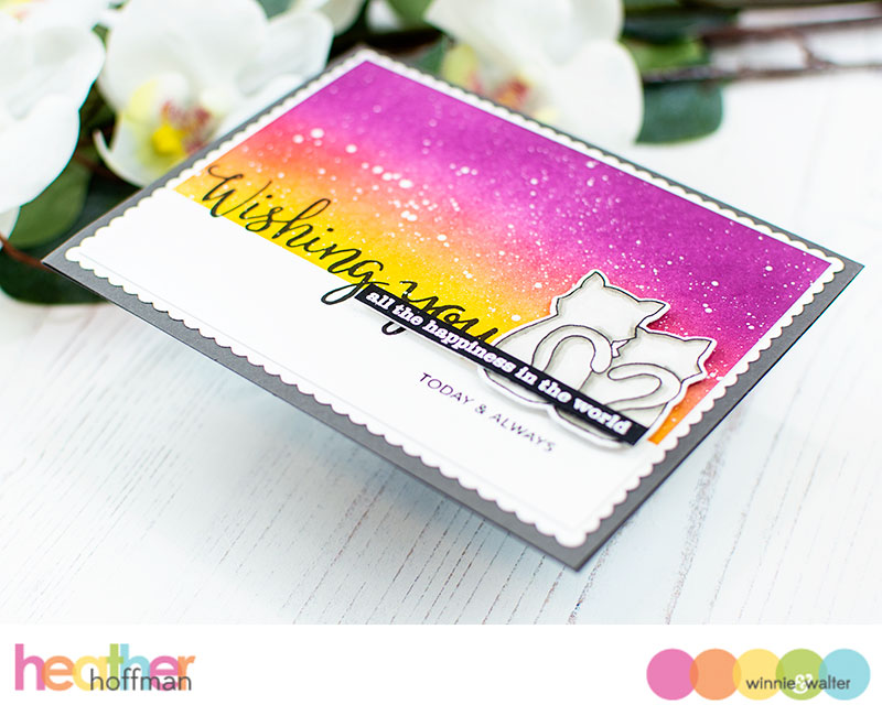 I also added some white splatters, then peeled off the masking tape at the bottom. Since it looked like a night sky, I colored up the adorable kitties from Purrfect with Evelin T Designs in simple Warm Gray Copic shades, and die cut them with the coordinating dies. The sentiment is a combination of Wishing You with Evelin T Designs and In Bloom: Frenchy's Festive Florals, with part of the sentiment heat embossed on a strip of black cardstock and popped up with foam adhesive. I also popped the kitties up with foam adhesive.