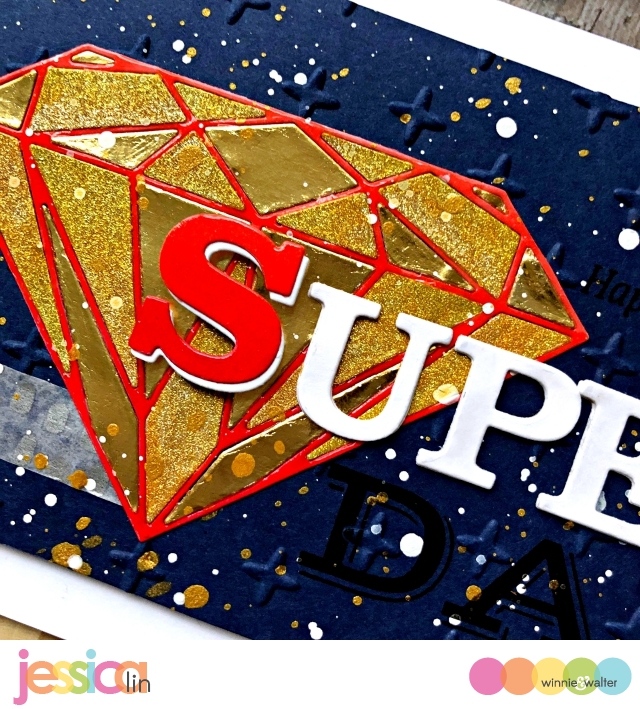 I started off by using the negative of the die cut from In a Word: Hi Cutaway to create my focal point sentiment. I used two shades of gray dye ink, then added some Nuvo Glimmer Paste over the top for some sparkle and shine!